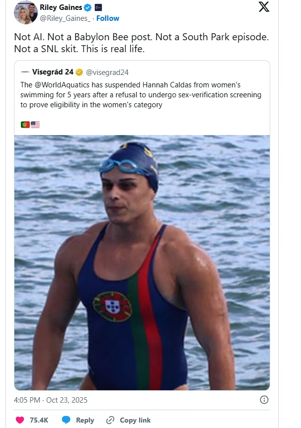 Райлі Гейнс — колишній плавець із Університету Кентуккі, який критикував трансгендерних спортсменів, — поділився новиною у соціальних мережах, прикріпивши до неї фотографію Кальдас.