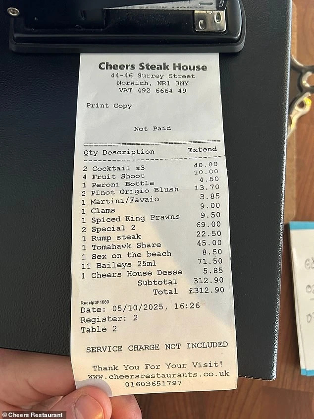 Увечері 5 жовтня у ресторані Cheers у Норіджі зібралася компанія із чотирьох жінок з дітьми. Гості ситно повечеряли, але не сплатили величезний рахунок, до якого входили стейки, десерти та коктейлі. Власниці закладу, Андреа Маріньо, довелося заплатити 312 фунтів стерлінгів із власних коштів.