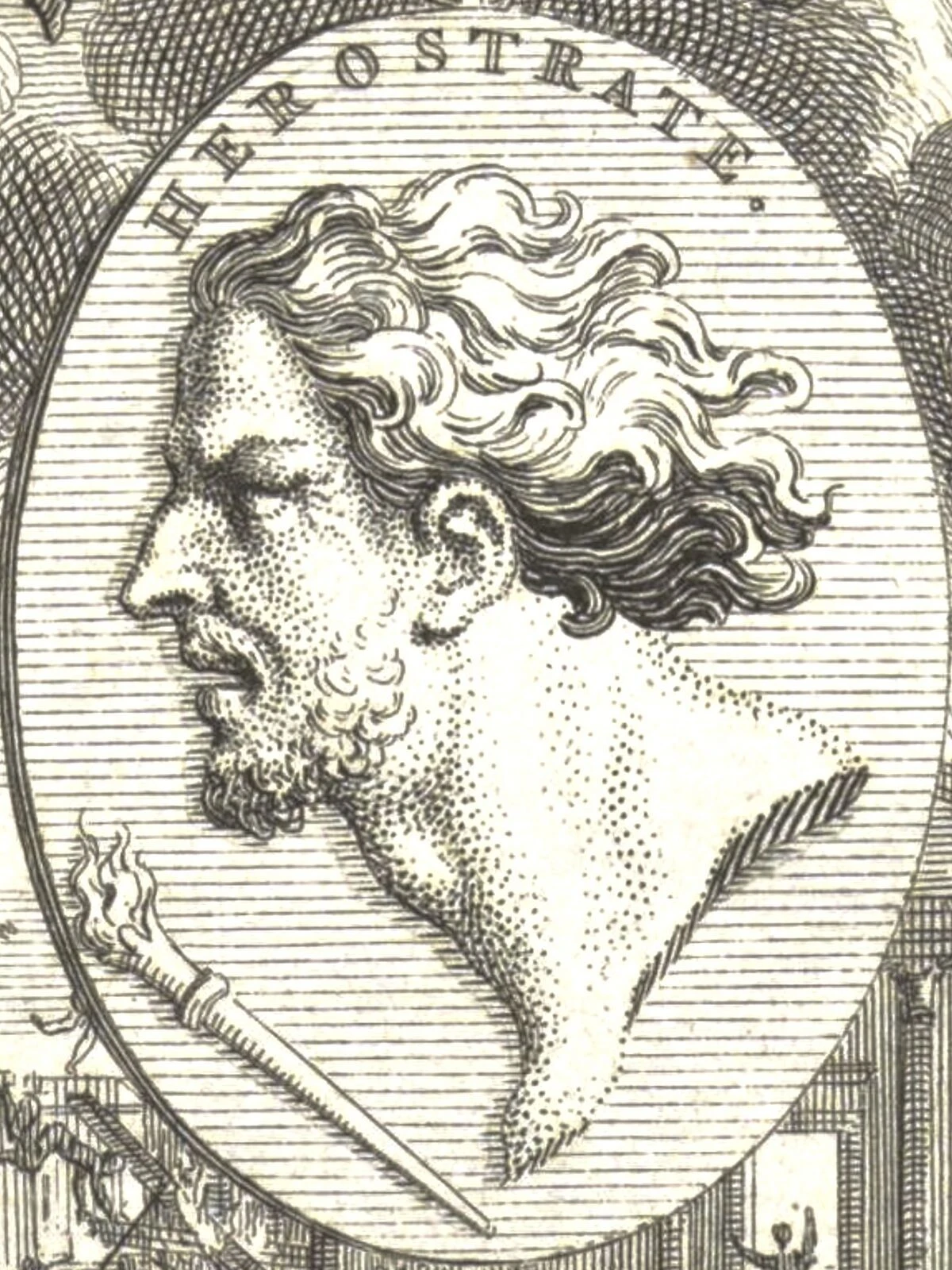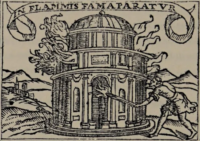 Герострат спалює храм Артеміди, картина Себастьяна де Коваррубіаса; на прапорі зображений латинський девіз, що означає "Слава, спалена у вогні"