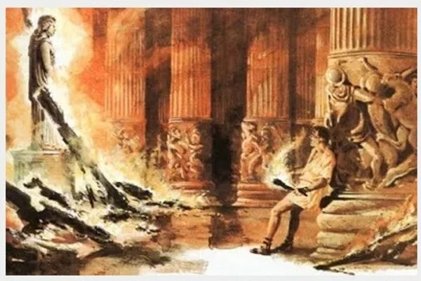 Тієї ж ночі, коли македонське царство тріумфувало з приводу народження нового царевича, в п'ятистах кілометрах через Егейське море нікчемний чоловічок на ім'я Герострат намірився вписати своє ім'я в історію. Він увійшов до храму Артеміди та підпалив його. Дерев'яне оздоблення храму, особливо його балки, статуя Артеміди і все храмове начиння миттєво спалахнули, і до ранку від чуда світу залишилися лише тридцять шість почорнілих мармурових колон та руїни, що димляться.