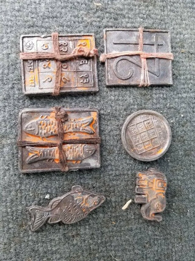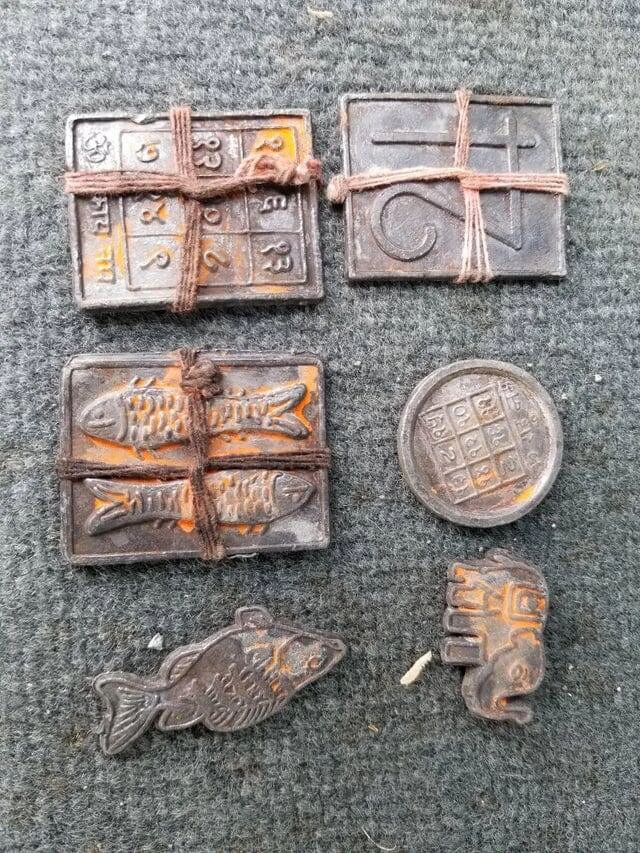 Бачив такі кілька тижнів тому. Не пам'ятаю, з якої вони є релігії, але це штуки, які кидають у воду на щастя або просто під час молитви. Вони дешеві і не мають ніякого значення після того, як їх кинули у воду. Тож їх можна залишити собі. І ні, вони не давні.