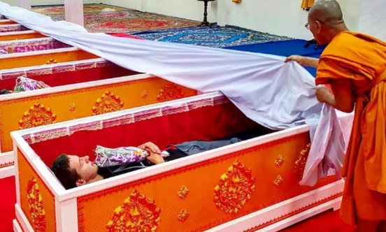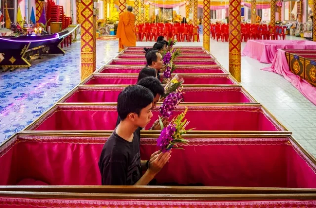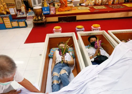 У Таїланді в храмах є незвичайна традиція для тих, хто хоче почати життя з чистого аркуша або позбутися стресу. Учасники ритуалу беруть квіти та лягають у труну, після чого їх накривають простирадлом, а ченці читають молитви. В результаті душа людини очищається, а старі проблеми мають піти.