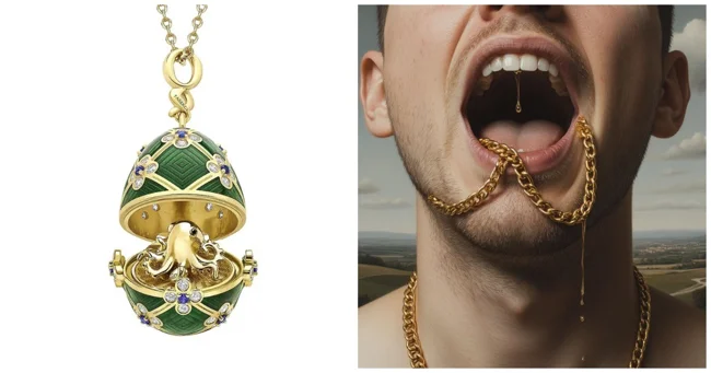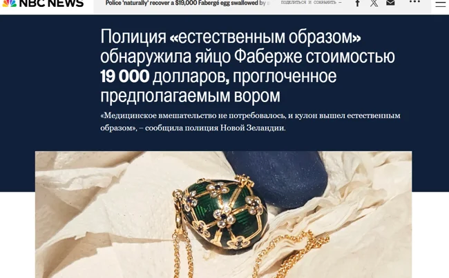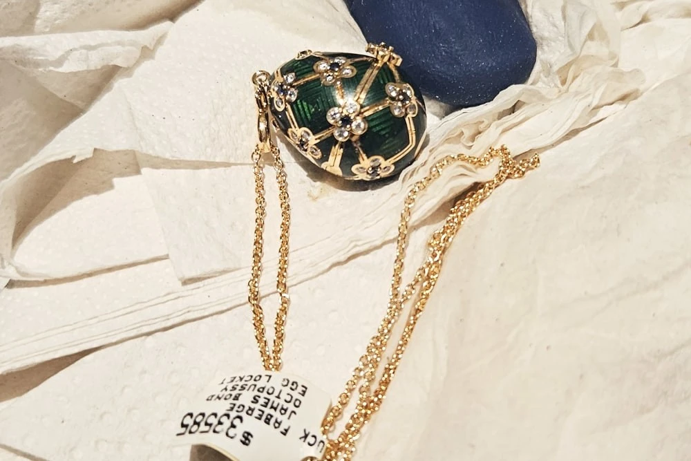 Кулон виявився непростим. Це лімітована серія Fabergé × 007. Золоте яйце вкрите зеленою емаллю, прикрашене десятками діамантів та сапфірів, а всередині ховається крихітний золотий восьминіг (відсилання до фільму "Восьминіжка" про агента 007). Ціна питання – 33 тисячі новозеландських доларів. Чоловік завзято заперечував свою провину, стверджуючи, що нічого не ковтав, а просто зайшов помилуватися красою.