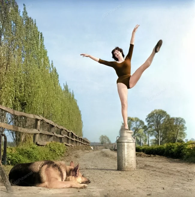 Балерина Джилліан Броді танцює на фермі. Тут вона виступає на бідоні для молока, 1959 рік.