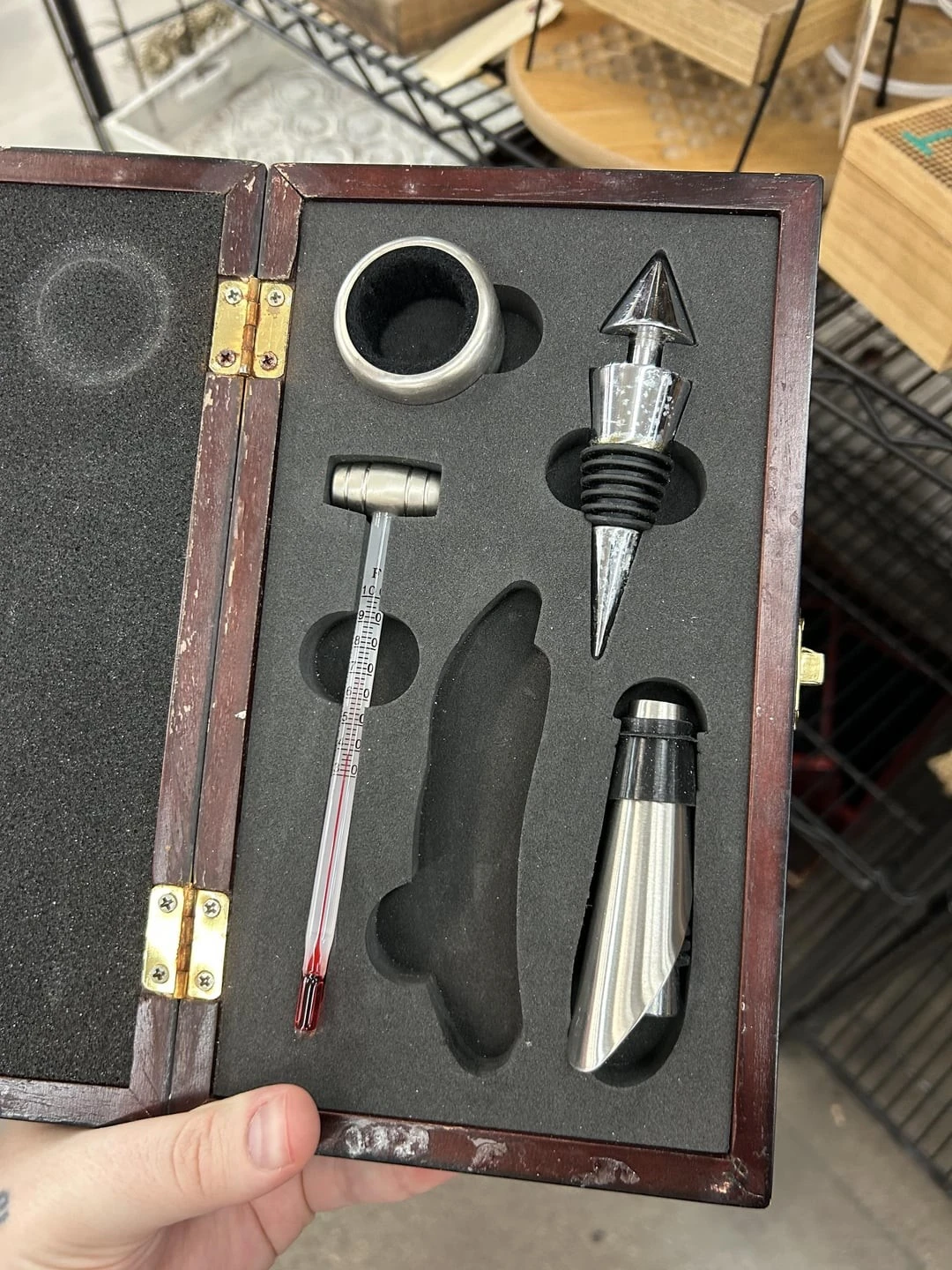 Набір для вина, у складі якого металева пробка, аератор, термометр і кільце-крапловловлювач. У порожньому відсіку має бути штопор.