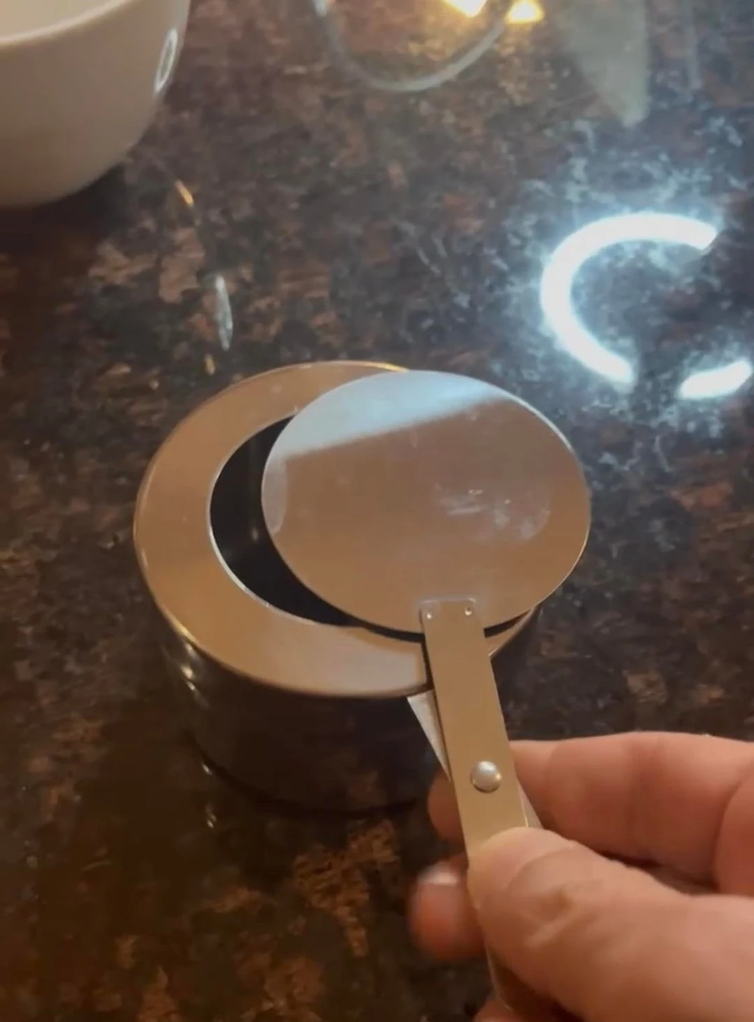 1. Невеликий металевий порожнистий прилад з ручкою, верхня частина на шарнірі, схожому на ножиці