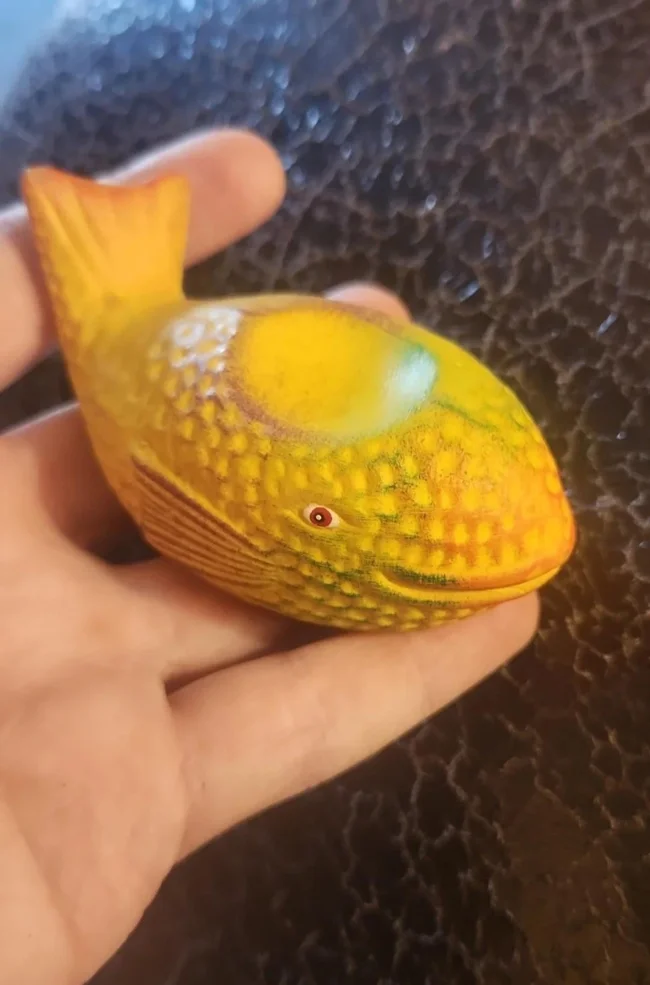 8. Невеликий жовтий керамічний кит, порожнистий усередині, з шорсткою поверхнею