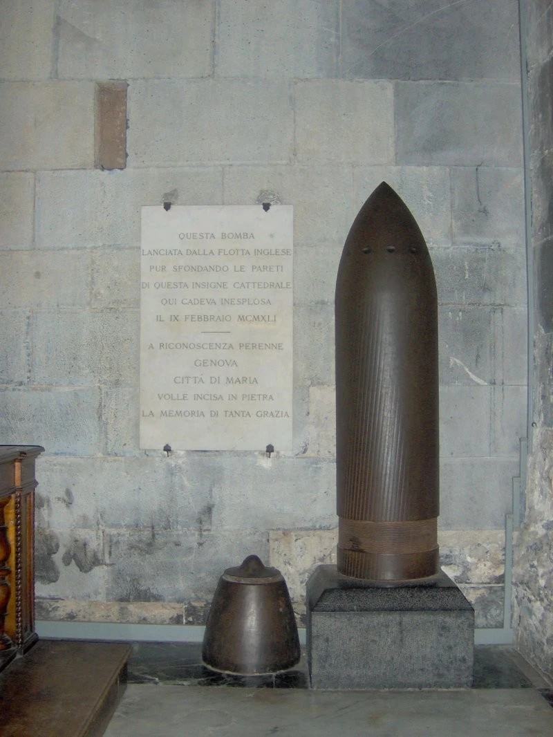 381-мм снаряд, що не розірвався, від гармати BL 15"/42 Mark I. Випущений лінкором HMS Malaya 9 лютого 1941 року під час обстрілу Генуї