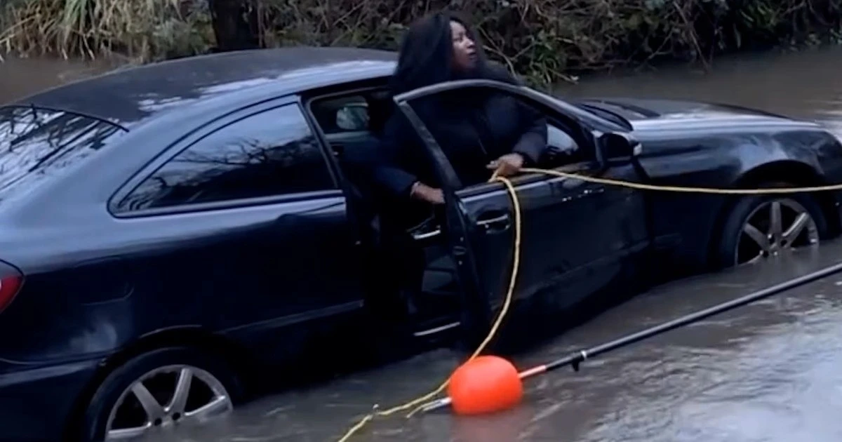 Пожежник кидає «мотузку» мотузку з люмінесцентним поплавцем, жінка відчайдушно чіпляється і відчиняє двері автомобіля. Виявляється, вода їй трохи нижче за коліно, і вона з легкістю виходить на берег.