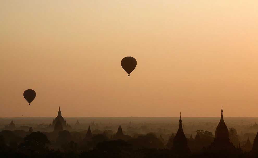4. Повітряні кулі летять над рівнинами, усіяними храмами. Багана, М'янма, 14 січня 2010 року. Баган, стародавня столиця М'янми, є головним місцем археологічних розкопок у країні та популярним туристичним місцем призначення. (REUTERS/Soe Zeya Tun)