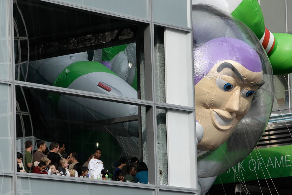 7. Літаюча надувна фігура у вигляді героя мультфільму «Історія іграшок» Базза Лайтера готується завернути за кут на перетині 42-ої Стріт та 6-ої Авеню під час параду на честь Дня Подяки 26 листопада 2009 року. Зменшені копії надувних фігур, що літають, має у своєму асортименті не один дитячий інтернет магазин. (AP Photo/Julie Jacobson)