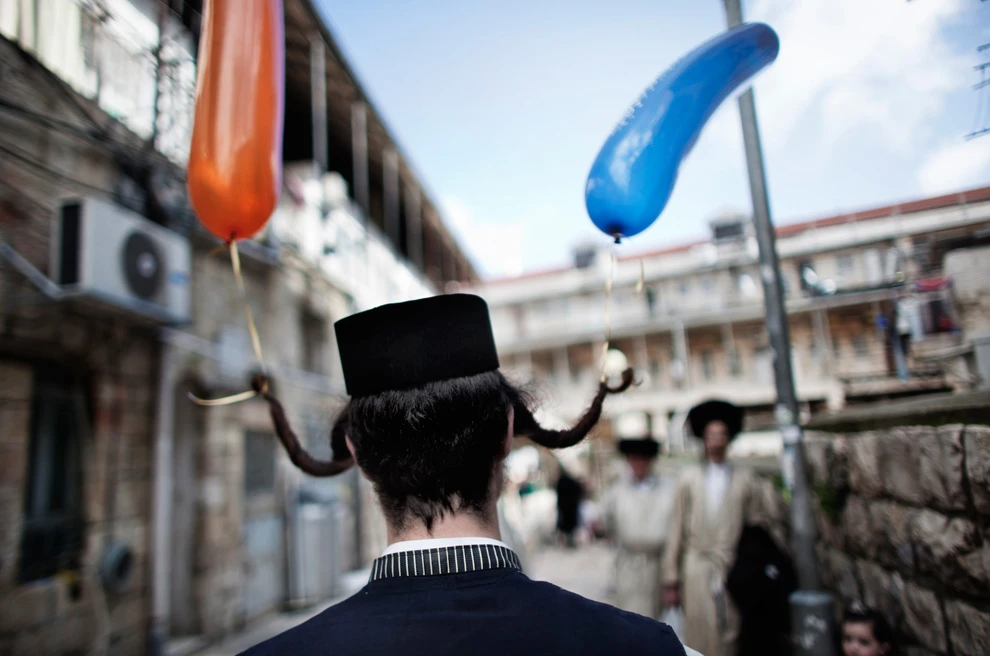 14. Ортодоксальний єврей, що прив'язав до кіск повітряні кульки, йде вулицею в районі Меа Шеарім в Єрусалимі під час єврейського свята Пурим 1 березня. Пурім символізує звільнення єврейського народу від гніту стародавніх персів. (MARCO LONGARI/AFP/Getty Images)