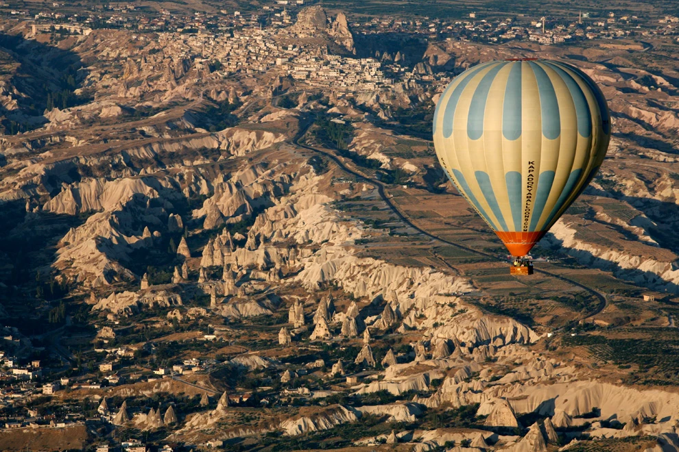 15. Повітряні кулі 19 серпня 2007 року у центрі Гереме, Каппадокія, Туреччина. Лава та білий попіл змішуються з повеневими водами і утворюють твердий, запечений на сонці шар, відомий як туфа. Цей шар поступово розмився, створивши неймовірні геологічні утворення, такі як знамениті «казкові труби». (Yoray Liberman/Getty Images)