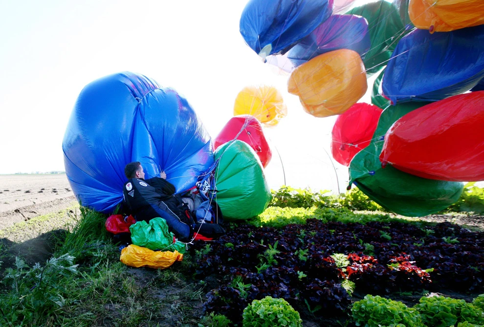 29. Американський повітроплавець Джонатан Траппе тримається за свою кулю після приземлення на полі в Моері, Франція, 28 травня. Траппе вилетів з Чаллока, Англія, щоб стати першою людиною, яка перетне Ла-Манш на стільці, прив'язаному до куль, надутих гелієм. Траппе планував цей політ кілька місяців, після того, як йому вдалося встановити світовий рекорд за найдовший переліт на кулі над Північною Кароліною (політ тривав 14 годин). (AP Photo/Gareth Fuller-pa)