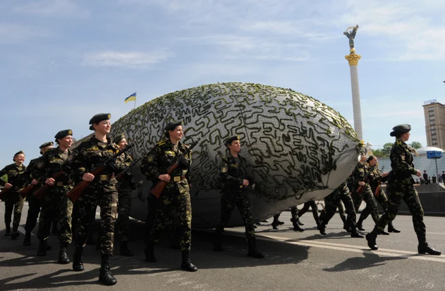 16. Українські солдати марширують із аеростатом загородження під час репетиції військового параду на честь Дня Перемоги 4 травня у центрі Києва. Чомусь ця фотографія стала часто використовуватися сеошниками при написанні відгуків про twite. (AP Photo/Sergei Chuzavkov)