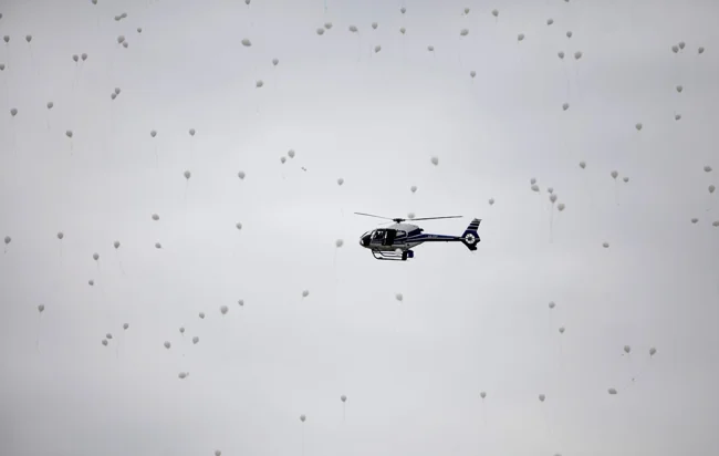 20. Вертоліт пролітає повз білі кульки, випущені під час демонстрації проти насильства, що відбулася в Монтерреї, Мексика, 28 березня. (AP Photo/Claudio Cruz)