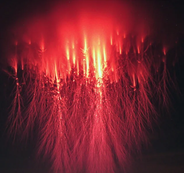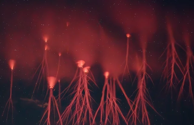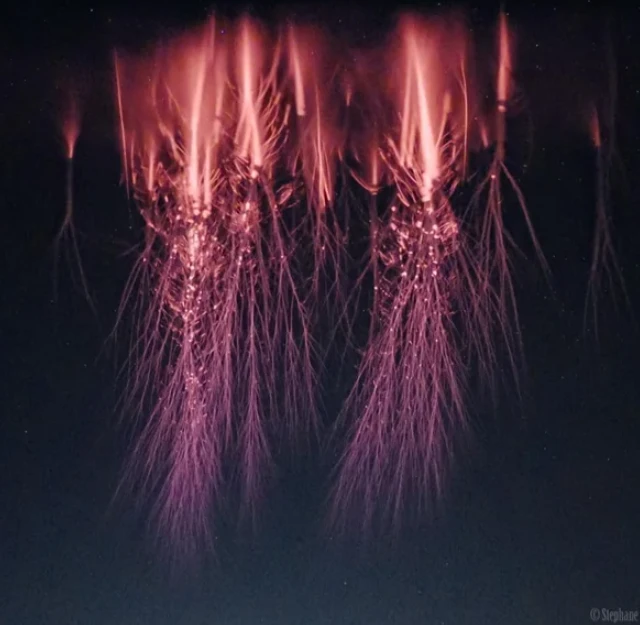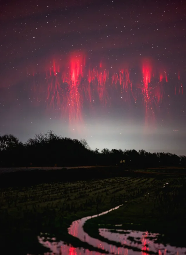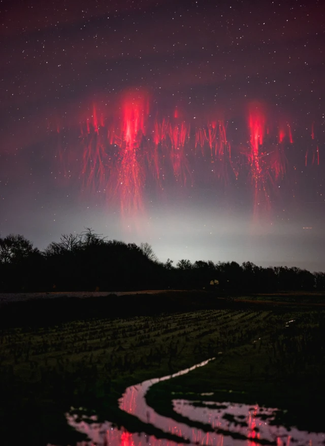 Червоні спрайти – це дивовижні атмосферні явища, що відбуваються високо над грозовими хмарами, приблизно на висотах від 50 до 90 кілометрів. Вони виглядають як вертикальні або роздвоєні свічення червоного кольору та пов'язані з блискавками, особливо верхніми розрядами у грозових хмарах. З'являються вони дуже швидко – всього за мілісекунду після спалаху блискавки – і часто їх важко помітити без спеціального обладнання, оскільки їхня яскравість невелика. Червоні спрайти є результатом сильних електромагнітних полів, що виникають унаслідок потужних гроз, які збуджують іонізацію верхніх шарів атмосфери. Ці явища цікаві вченим, оскільки допомагають зрозуміти взаємодія між земними електромагнітними процесами і верхніми шарами атмосфери, і навіть пов'язані з глобальними електричними полями. Дослідження червоних спрайтів важливе для розширення наших знань про динаміку атмосфери та її електромагнітних процесів.