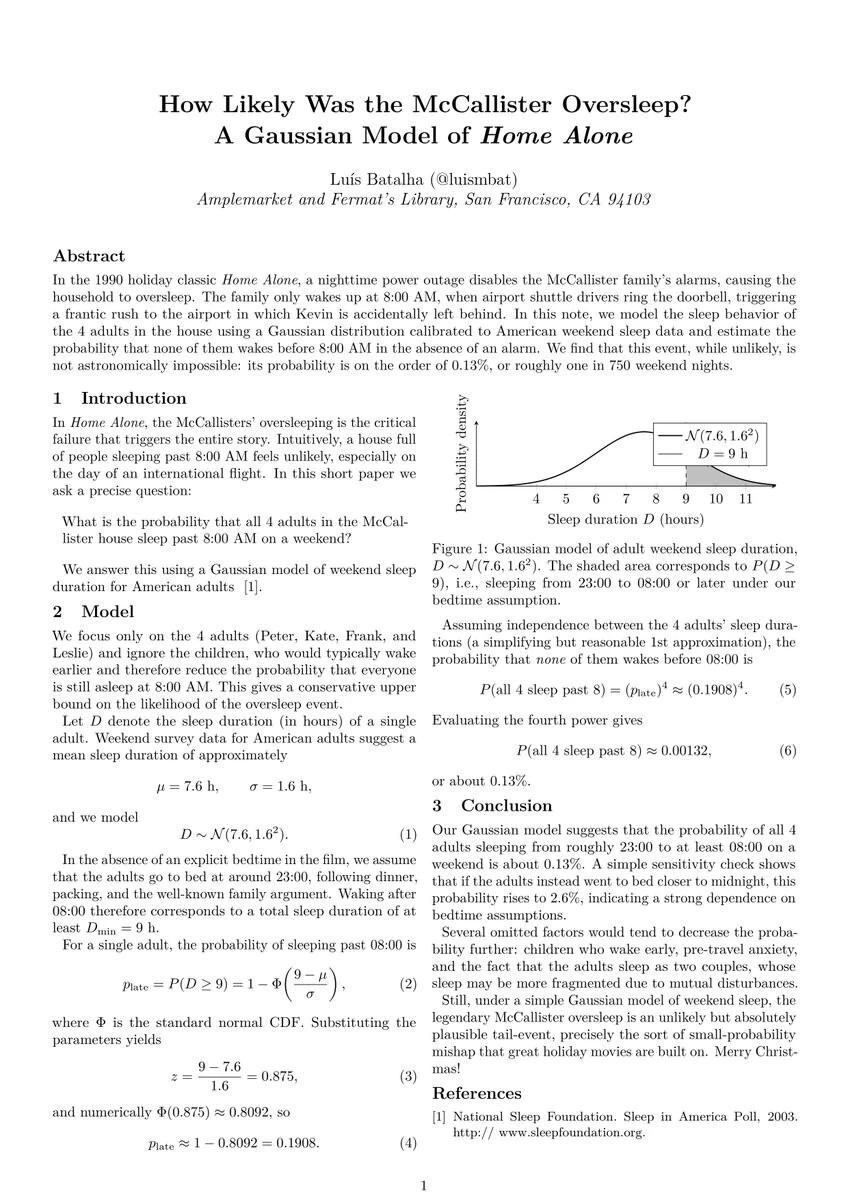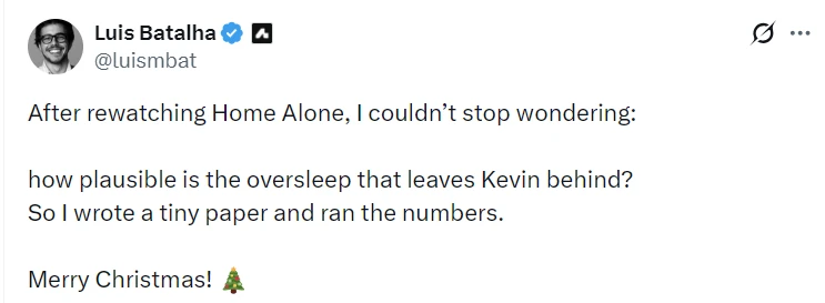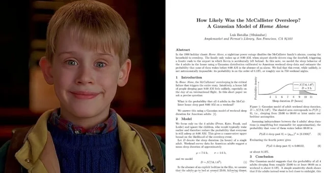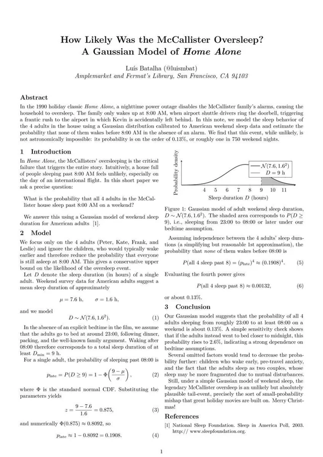 Я переглянув "Один вдома" і тепер мене не мучить одне питання: Наскільки правдоподібною є ситуація, при якій Маккалістери проспали і забули Кевіна вдома? У зв'язку з чим я написав невелику наукову статтю та зробив необхідні розрахунки. Веселого Різдва!