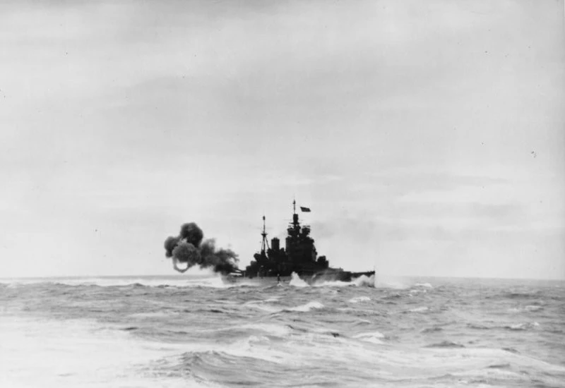 HMS Duke of York веде вогонь головним калібром на навчаннях 27 лютого 1942 року