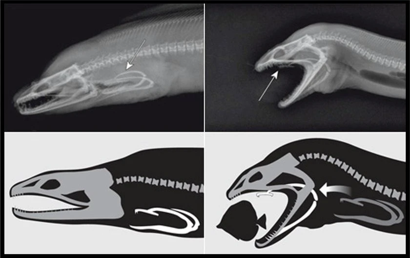 Зазвичай променепері риби (до яких належить і мурена) свій видобуток всмоктують. Для того, щоб пилососити океан, вони різко роззявляють рота. Об'єм збільшується, тиск знижується, і нещасна жертва разом із водою спрямовується прямо в пащу. Але мурени не шукають легких шляхів. Ці хижаки сидять у засідці серед скель і коралів, тому розширення ротової порожнини, необхідне створення вищеописаного смертельного атракціону, обмежено вузьким простором. А їсти хочеться! Тому мурени обрали більш ефективний та ефектний спосіб. Вони з'явилися другі щелепи.