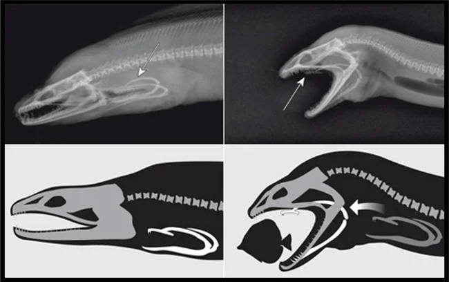 Побачити ці щелепи досить важко, тому що в спокійному стані вони ховаються глибоко в ковтку риби.