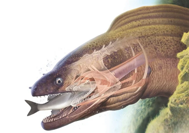 У мурені немає нічого зайвого. Грудні та черевні плавці відсутні, замість луски — гладка слизька шкіра. Все для того, щоб пересуватися у воді з мінімальним опором. Зайві нарости на тілі мурена не може дозволити собі ще з однієї причини — живе вона у звивистих коридорах коралових рифів, печер та скель. Але ніби природі здалося всього цього мало. «Треба придумати ще щось, додати, так би мовити, вишеньку на торт», — подумала вона і — та-дам! Додала мурені другу пару щелеп!