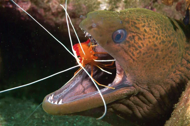 Незважаючи на буйну вдачу і скляний погляд безжального вбивці, навіть такий персонаж примудрився обзавестися друзями! Представляю вашій увазі середземноморських креветок! Дружба ця, щоправда, з розрахунку. Креветка мешкає на тілі риби, очищаючи її від паразитів та залишків їжі. Натомість малюк отримує притулок та надійний захист в особі одного з найстрашніших хижаків океану. Оце дах!