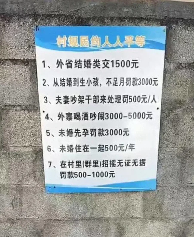 Згідно з оголошенням, вивішеним у грудні 2025 року, за шлюб з людиною з іншої провінції покладався штраф у розмірі 1500 юанів. Вагітність поза шлюбом або народження дитини менш ніж через 9 місяців після весілля каралися 3000 юанів. Спільне проживання без офіційної реєстрації шлюбу оподатковувалося щорічним штрафом у 500 юанів. За аморалку платити треба.