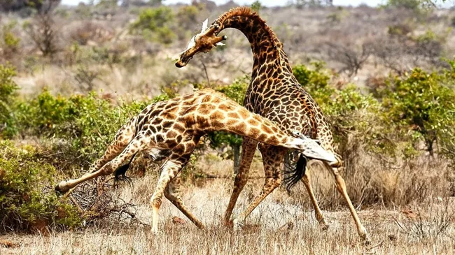 До відкритої конфронтації доходить рідко. Справа ця травмонебезпечна. Тому конфлікти жирафи намагаються вирішувати безконтактно.