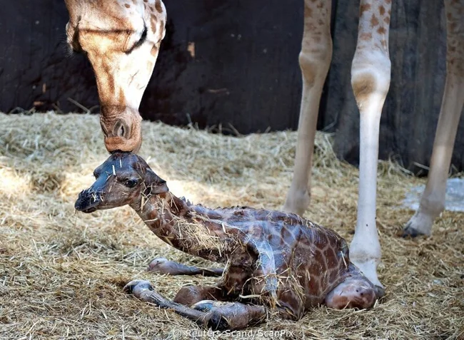 Пологи у жирафів відбуваються стоячи. Коли теля родиться, він падає з висоти близько двох метрів, ударяючись об землю. Це виглядає жорстко, але саме цей удар допомагає розірвати пуповину та стимулювати перше дихання. Як ляпанець по попці немовляти.