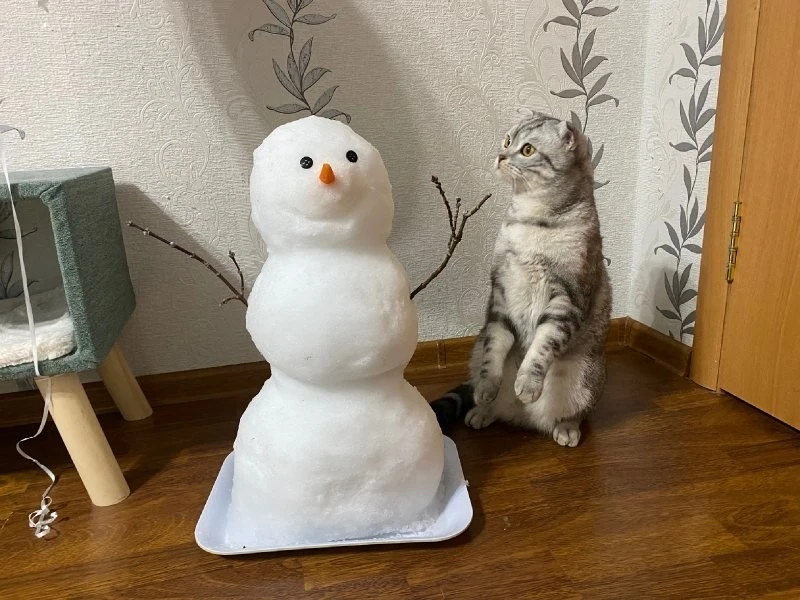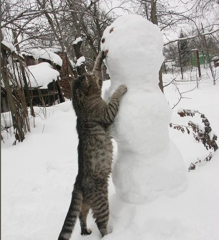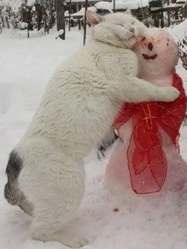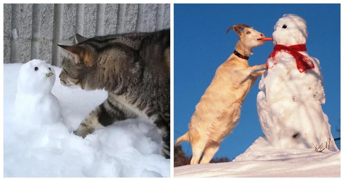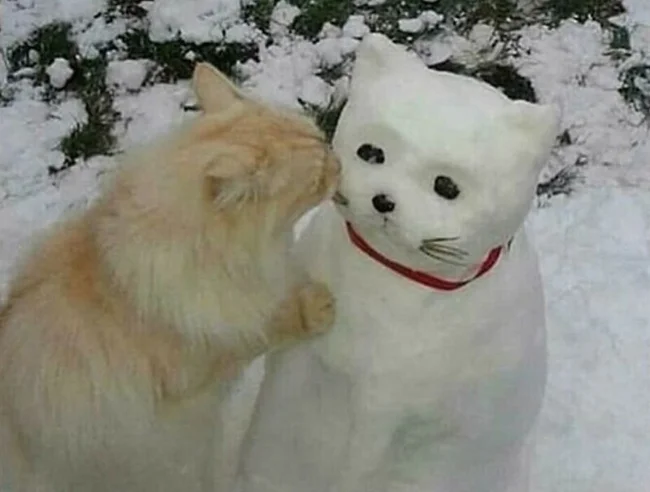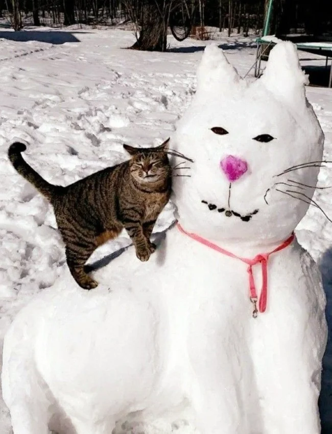 А що, якщо зліпити не просто сніговика, а цілого сніжного котеня чи піселя? Ці фото доводять, що зустріч домашніх улюбленців як зі звичайними сніговими чоловічками, так і зі своїми копіями породжує неймовірно щирі, кумедні та зворушливі моменти. Від цікавого сопіння та ввічливого ігнорування до дружніх обіймів та спроб експропріювати найцінніше (морквину), ці симпатяги демонструють величезний спектр найрізноманітніших емоцій від зустрічі зі своїми сніговими побратимами.