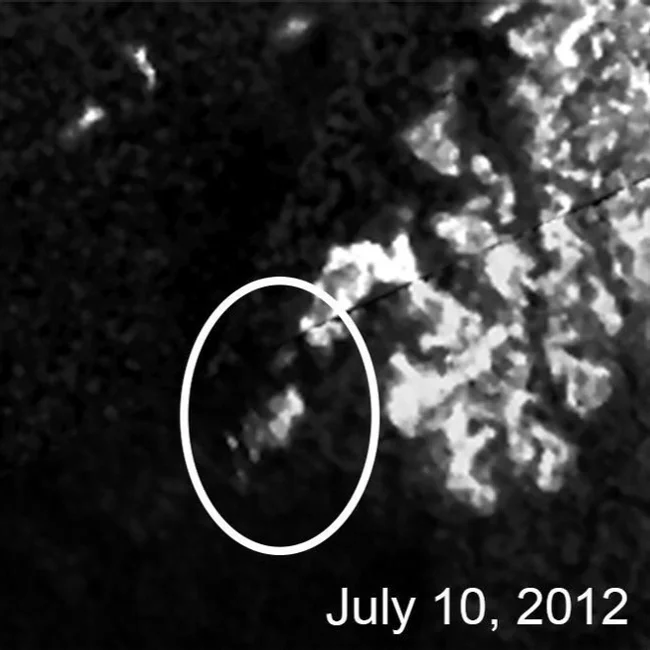 NASA пов'язало аномалію з формуванням та руйнуванням незвичайних айсбергів. Море Лігеї складається з рідких вуглеводнів - переважно метану. Температура на поверхні Титану близько -179 градусів Цельсія, що дозволяє метану та етану існувати у рідкому вигляді. Але при сезонному охолодженні чи зміні тиску ці органічні сполуки замерзають, формуючи плаваючі брили – аналоги земних айсбергів. Процес може починатися навколо центрів кристалізації - твердих частинок, що потрапили в рідину: порошин з атмосфери або уламків породи з берега. Навколо таких "зародків" наростає лід, утворюючи потужні структури. Але варто температурі підвищитись, і ця природна освіта починає руйнуватися, що ми бачимо на третьому зображенні (яскрава вершина зникла, а масивна основа "пришвартувалася" до берега).
