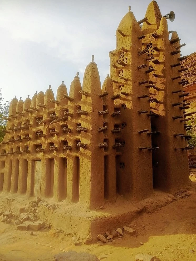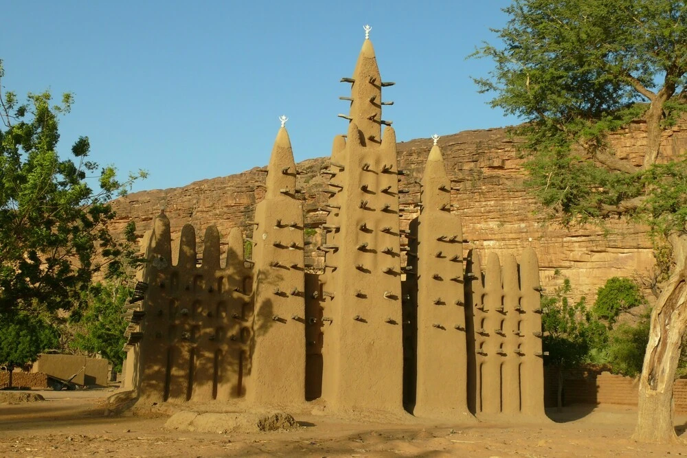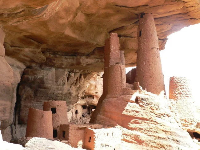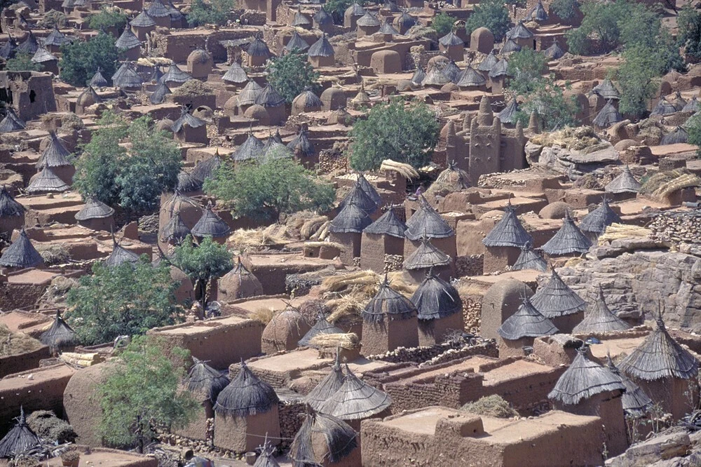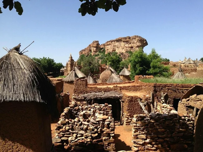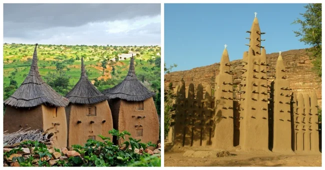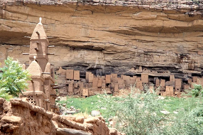 На задньому плані видно залишки жител стародавнього народу теллем, на передньому плані глиняна мечеть сучасного села догонів