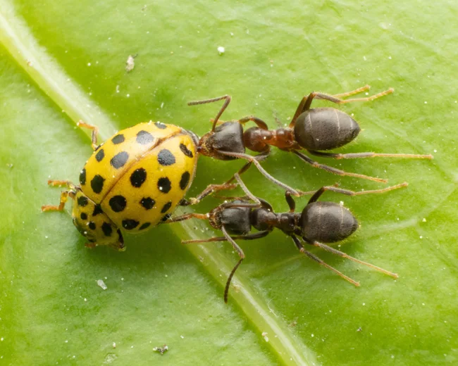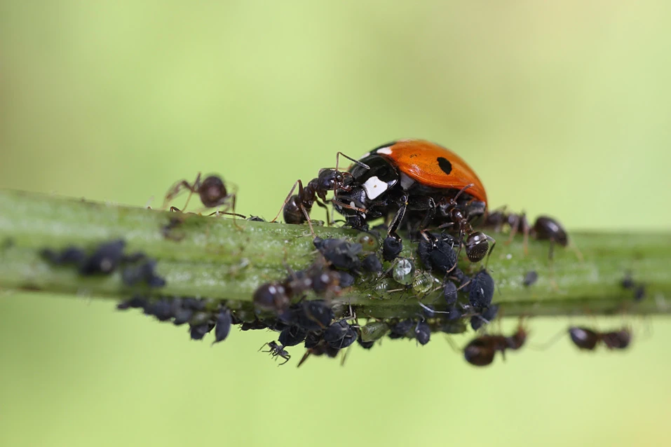 І навіть мурашина охорона не в змозі його перемогти. Жорсткі надкрила захищають практично все тіло жука, а його щелепи досить сильні, щоб відкусити мураху лапу. Тільки скоординована робота кількох десятків мурах здатна відігнати сонечко від стада попелиці. На якийсь час.