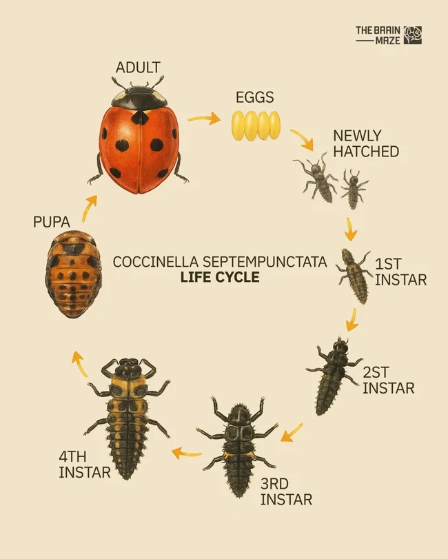 Цикл розвитку семиточкового сонечка. Саме її ви бачите найчастіше на ваших городах.