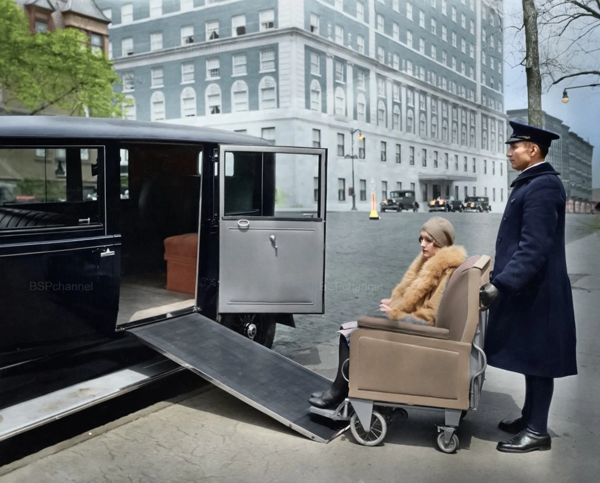 Жінка в інвалідному візку заїжджає по пандусу в автомобіль, що очікує. Нью-Йорк, 1933 рік.