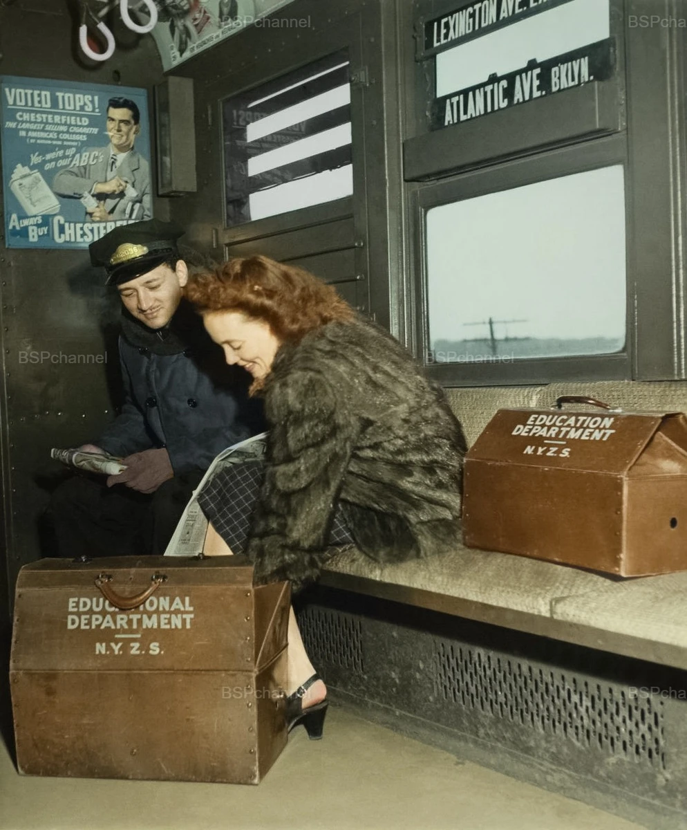 Вчителька демонструє незвичайний вміст своєї сумки кондуктору метро у Нью-Йорку, 1940-ті.