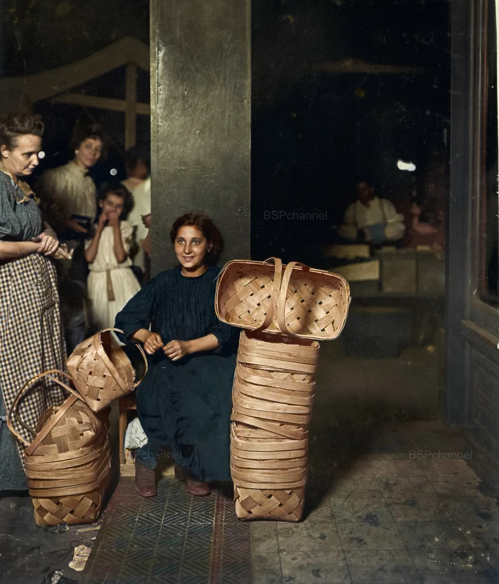 Олена торгувала на ринку біля самого входу в салун. Вона приходила на місце о 10-й ранку, а коли фотограф Льюїс Хайн зробив свій знімок о 23:00, вона все ще була за роботою. Це було у серпні 1908 року.