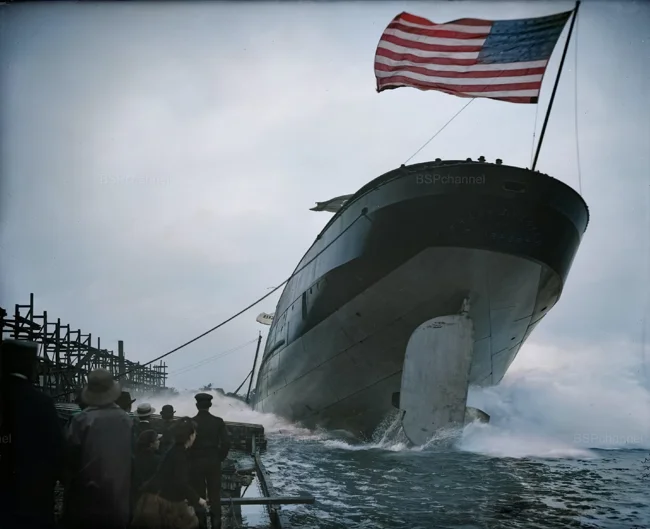 Спуск на воду пароплава "Frank J. Hecker" з верфі від пристані озера Сент-Клер. США, 1905 рік.
