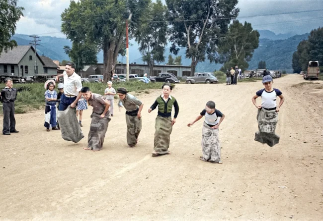 Біг у мішках серед хлопчиків, святкування Дня праці, Ріджуей, Колорадо, 1940 рік.