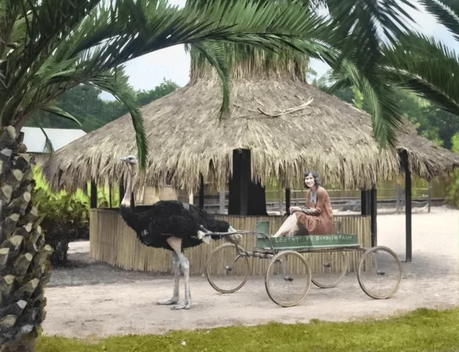 У 1886 році Едвард Коустон привіз страусів до Каліфорнії з цілком прагматичною метою - продавати їхнє пір'я як модні прикраси для дамських капелюхів. Однак бізнес виявився не таким прибутковим, як очікувалося, і тоді Коустон знайшов куди оригінальніше застосування своїм підопічним: він почав возити туристів на возах, запряжених страусами. Ідея виявилася блискучою. Ферма швидко стала популярною пам'яткою, на яку прагнули подивитися всі, хто хотів побачити цих екзотичних птахів наживо. Настільки затребуваною, що залізнична компанія Pacific Electric навіть збудувала спеціальну станцію прямо біля воріт ферми, щоб туристам було зручніше добиратися. Відвідувачі могли не тільки покататися верхи на страусах і покататися в екзотичній упряжці, а й забрати з собою на згадку страусове пір'я. Ферма проіснувала до 1935 року, але зараз працює музей.