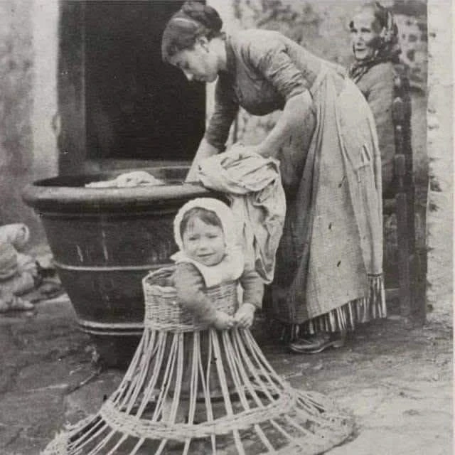 11. Малюк навчається ходити в плетених ходунках, поки мати займається домашніми справами (Європа, кінець XIX – початок XX століття)