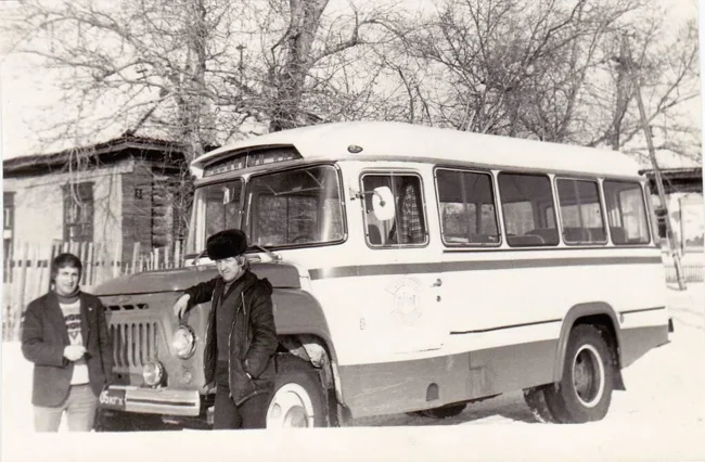 17. Чоловіки на тлі КАВЗ-685 – популярного в СРСР автобуса середнього класу капотного компонування на вантажних шасі ГАЗ-53-12.