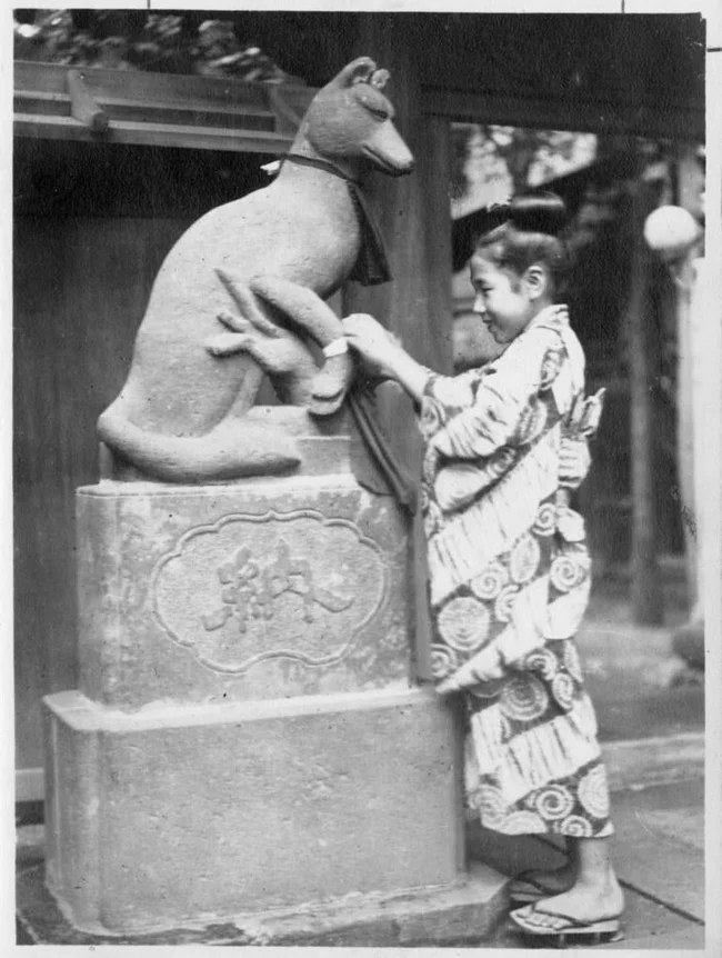 7. Дівчина прив'язує папірець з бажанням (ема) на статую лисиці у святилищі Інарі (Японія)