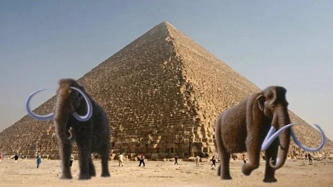Коли зводилися перші піраміди, шерстисті мамонти все ще ходили по Землі. Основна популяція цих гігантів вимерла близько 10 000 років тому, проте невелика колонія, що налічувала приблизно 1000 особин, вижила на маленькому арктичному острові, відомому як острів Врангеля. Археологи встановили, що ці мамонти мешкали там приблизно до 1650 року до нашої ери. Це майже на тисячоліття пізніше за будівництво Великої піраміди в Гізі.