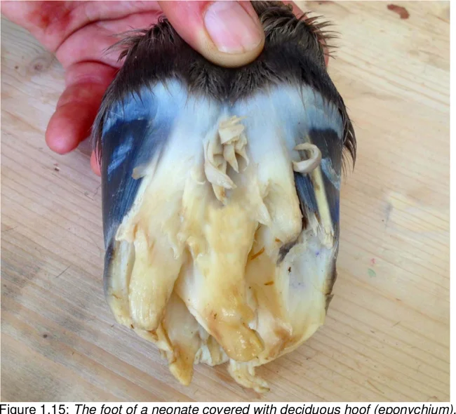 А потім він відшаровується і стирається в перші хвилини ходьби, оголюючи тим самим заховані копита. Адже це звичайна шкіра, м'яка та вразлива. При цьому самі малюки відчувають лише легкий свербіж. Адже в копитній капсулі практично відсутні кровоносні судини та нервові закінчення.