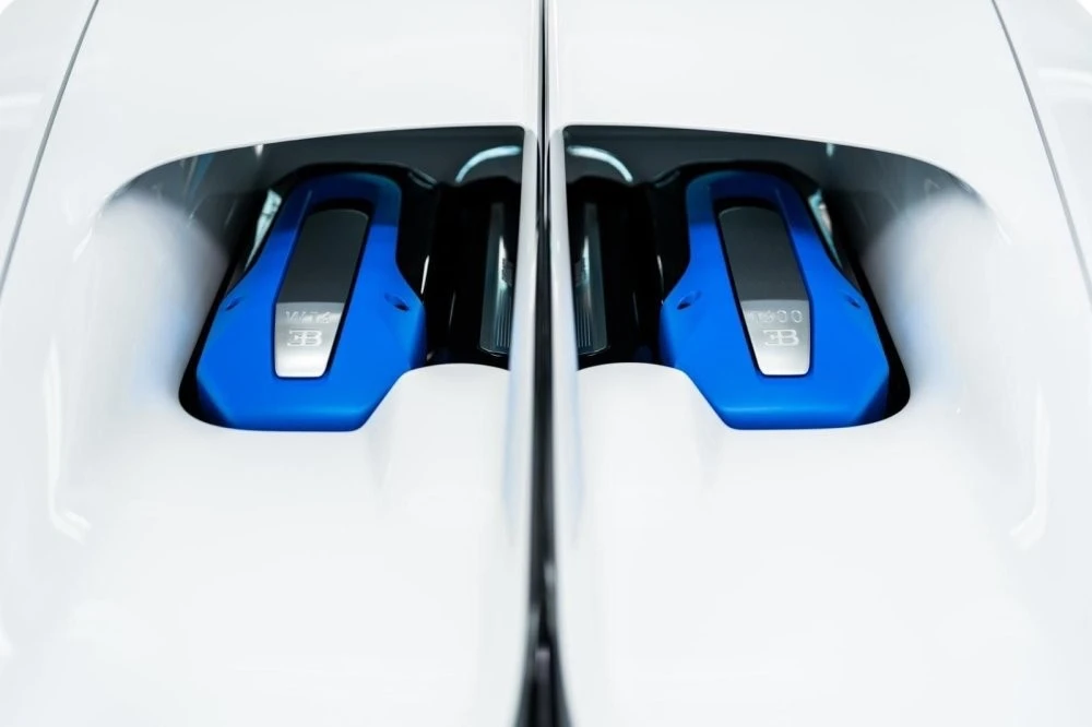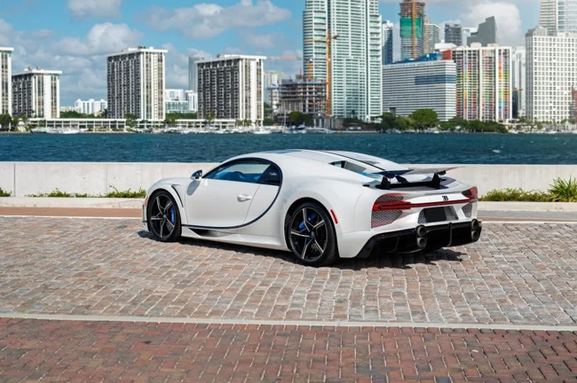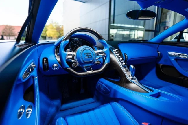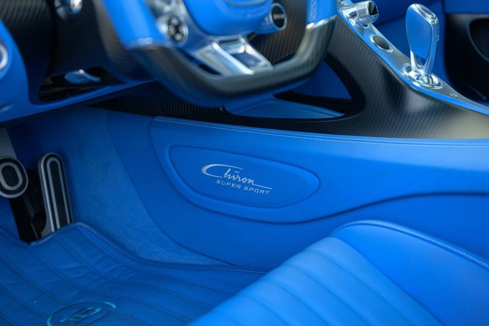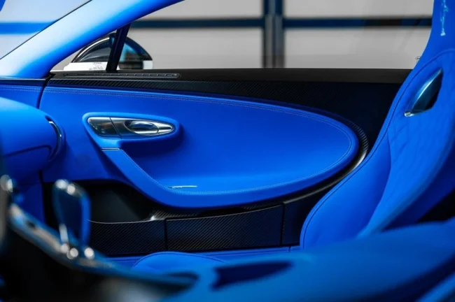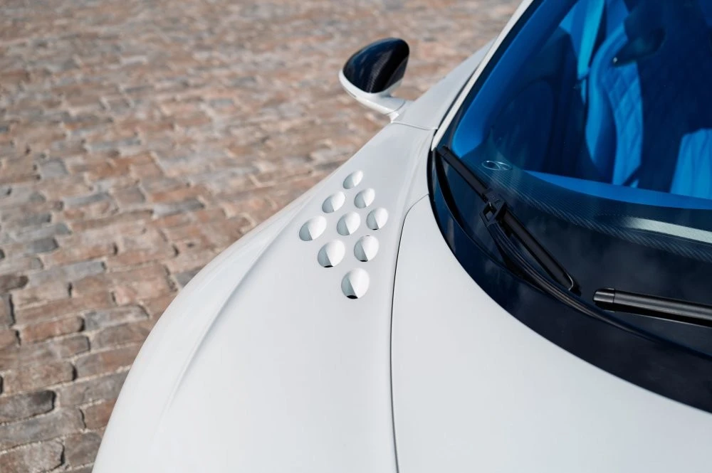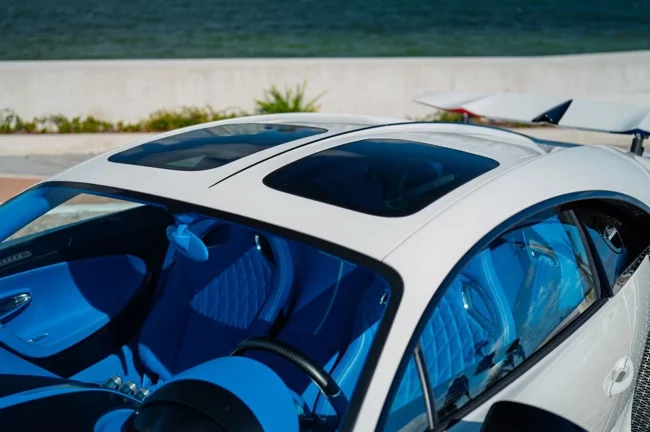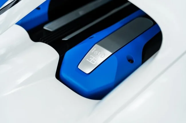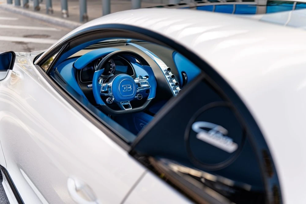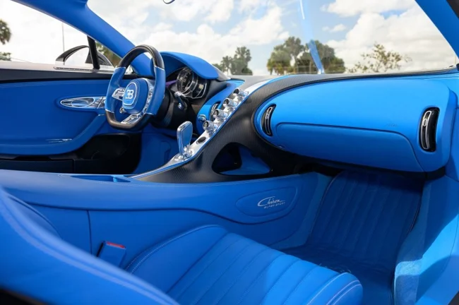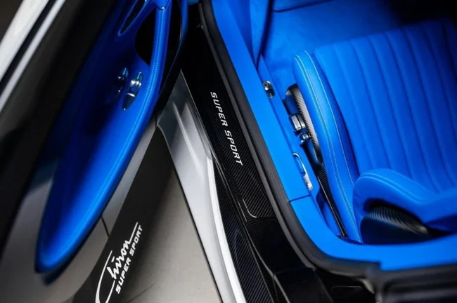 Кузов пофарбований у відтінок Glacier White, салон повністю виконаний у кольорі French Racing Blue. Гіперкар 2024 випуску не простоював, його пробіг становить 4450 кілометрів. Як і належить машині подібного класу та статусу, Chiron перебуває в ідеальному, колекційному стані.