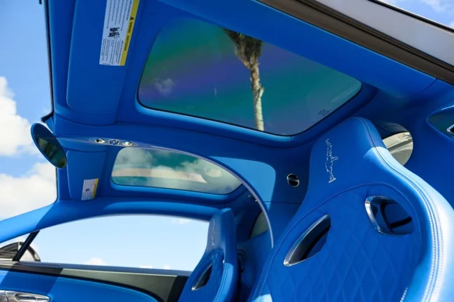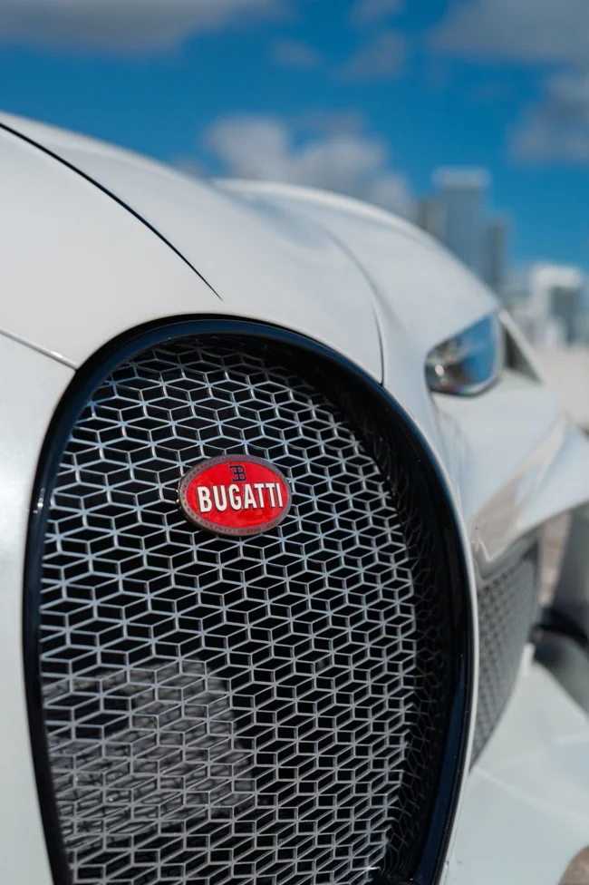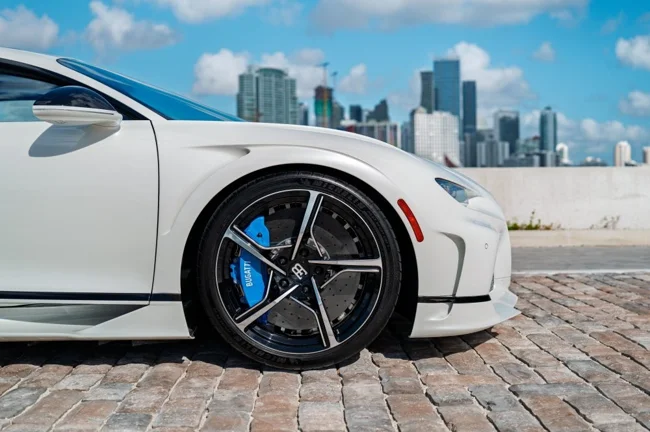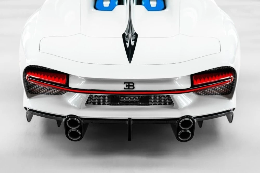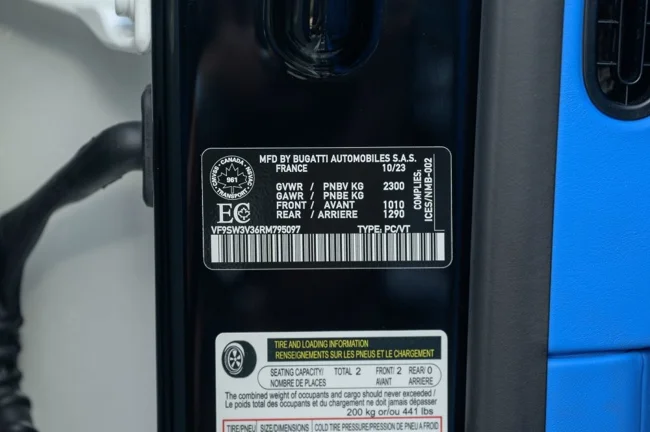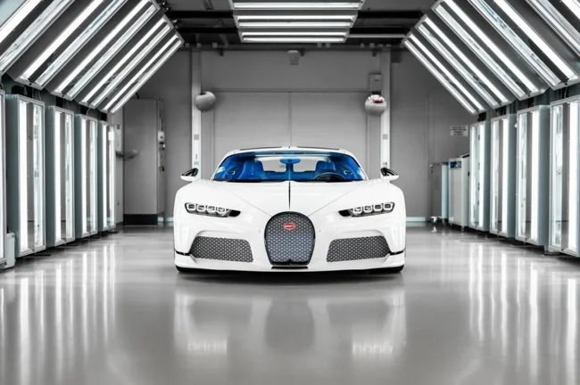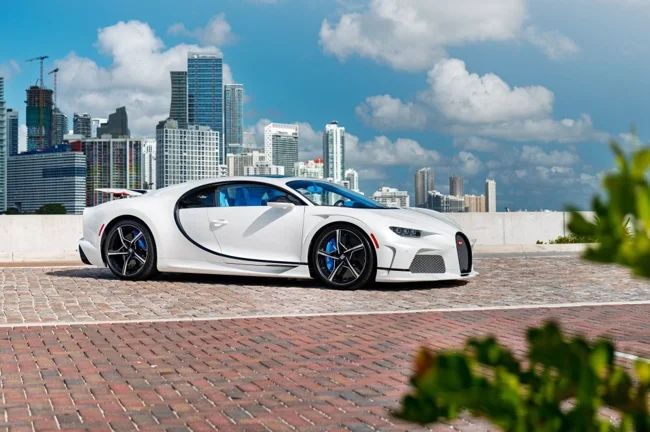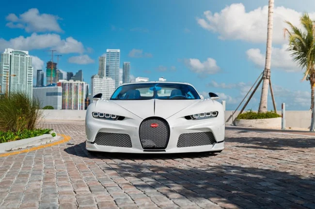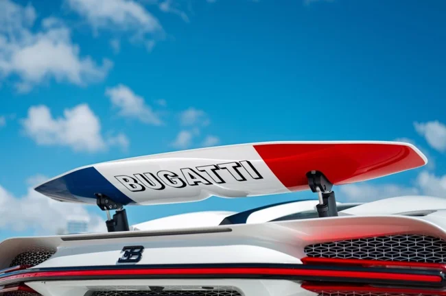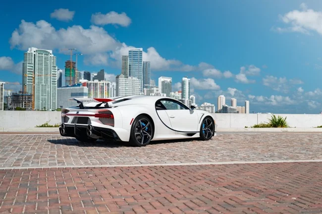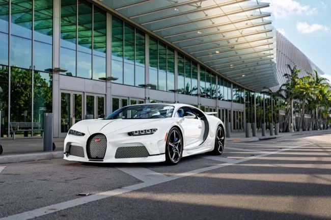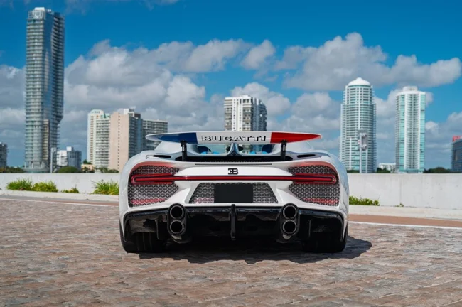 Кузов пофарбований у відтінок Glacier White, салон повністю виконаний у кольорі French Racing Blue. Гіперкар 2024 випуску не простоював, його пробіг становить 4450 кілометрів. Як і належить машині подібного класу та статусу, Chiron перебуває в ідеальному, колекційному стані.