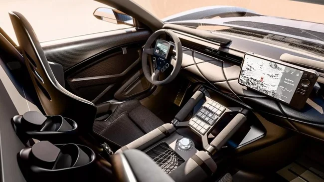 Усередині дизайнери пропонують такий собі спортивний мінімалізм, але з нальотом розкоші. Сидіти водію та пасажиру належить у ківшах з багатоточковими ременями, передня панель оздоблена стьобаною шкірою та алькантарою. Останню можна знайти і на спеціальних ручках на центральній консолі. Спортивна цифрова приладка розміщена прямо на кермі, а ще один дисплей із навігаційною системою стоїть перед пасажиром.