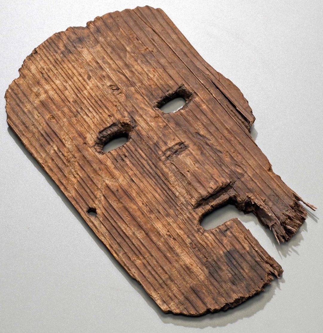 13. Дерев'яна маска, датована початком III століття н.е., виявлена в 2023 на руїнах Нісі-Івата в Осаці, Японія. Археологи вважають, що цей предмет використовувався під час свят врожаю для звернень до богів